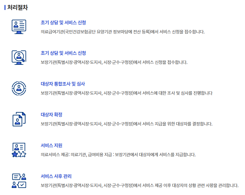 ※초기 상담 및 서비스 신청 → 대상자 통합조사 및 심사 → 대상자 확정 → 서비스 지원 → 서비스 사후관리