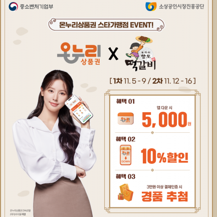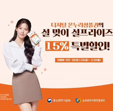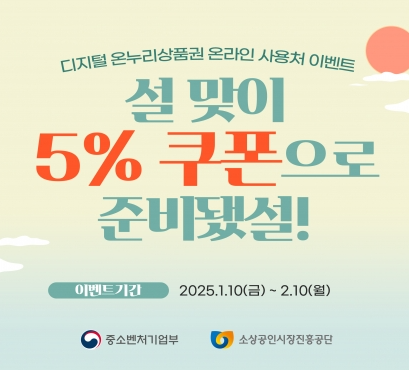 ● 온누리상품권 최대 35% 할인 혜택: 온누리시장, 온누리전통시장 등 12곳의 온라인 전통시장관 특별할인전에서 디지털상품권으로 상품구매시 상품금액의 5% 할인쿠폰을 적용할 수 있습니다. 디지털상품권 구매할인(15%), 환급행사(15%)와 더불어 온라인전통시장관에서 할인쿠폰(5%)까지 모두 적용 받는다면 최대 35% 할인 혜택으로 상품을 구매할 수 있습니다.