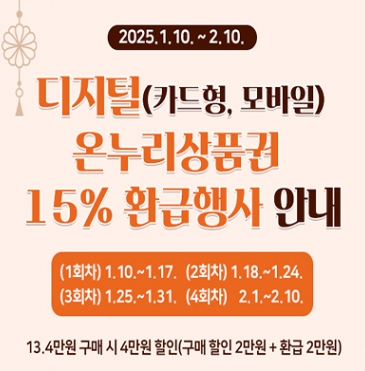 ● 온누리상품권 결제액 15% 환급: 디지털 온누리상품권으로 결제하면 결제액의 15%를 디지털 상품권 형태로 환급받을 수 있는 혜택이 제공됩니다. 1인당 최대 2만 원까지 환급받을 수 있으며, 이 환급된 금액은 후속 구매에 사용할 수 있습니다. 이는 설 명절 기간 동안 실속 있게 쇼핑을 즐길 수 있는 큰 장점이 됩니다.