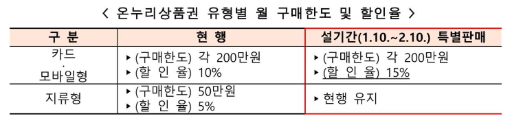 ● 온누리상품권 할인율 상향: 디지털 온누리상품권은 기존 10%의 할인율을 제공하였으나, 이번 이벤트 기간 동안에는 할인율이 15%로 상향 조정되었습니다. 이를 통해 소비자들은 더 많은 금액을 절약하면서 상품권을 구매할 수 있게 됩니다. 예를 들어, 10만 원을 구매하면 1만 5천 원을 할인받을 수 있어, 실질적인 소비 절감 효과가 큽니다.