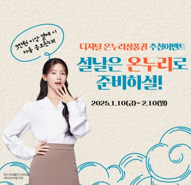 ●온누리상품권 추첨 이벤트 : 디지털상품권 사용자들을 위한 추첨이벤트도 진행합니다. 온라인,오프라인 합산 3만원이상 사용시 자동응모되며, 2월 중 추첨을 통해 카드, 모바일형 상품권 사용자 각 2,025명에게 디지털상품권을 차등 지급합니다.