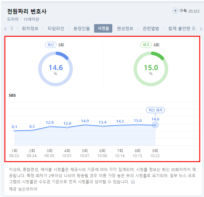 천원짜리 변호사는 연이은 결방, 종영 소식에도 시청률 14%를 유지하고 있습니다. 전주에 비해 소폭 하락하였지만 이는 스페셜 편 방송분으로 인한 여파이지 않을까 조심스럽게 추측해봅니다. 천원짜리 변호사 시청률은 동 시간대 방송분 시청률 1위이며, 전 채널을 통틀어 미니시리즈 중 1위에 해당하는 시청률을 기록하고 했습니다.