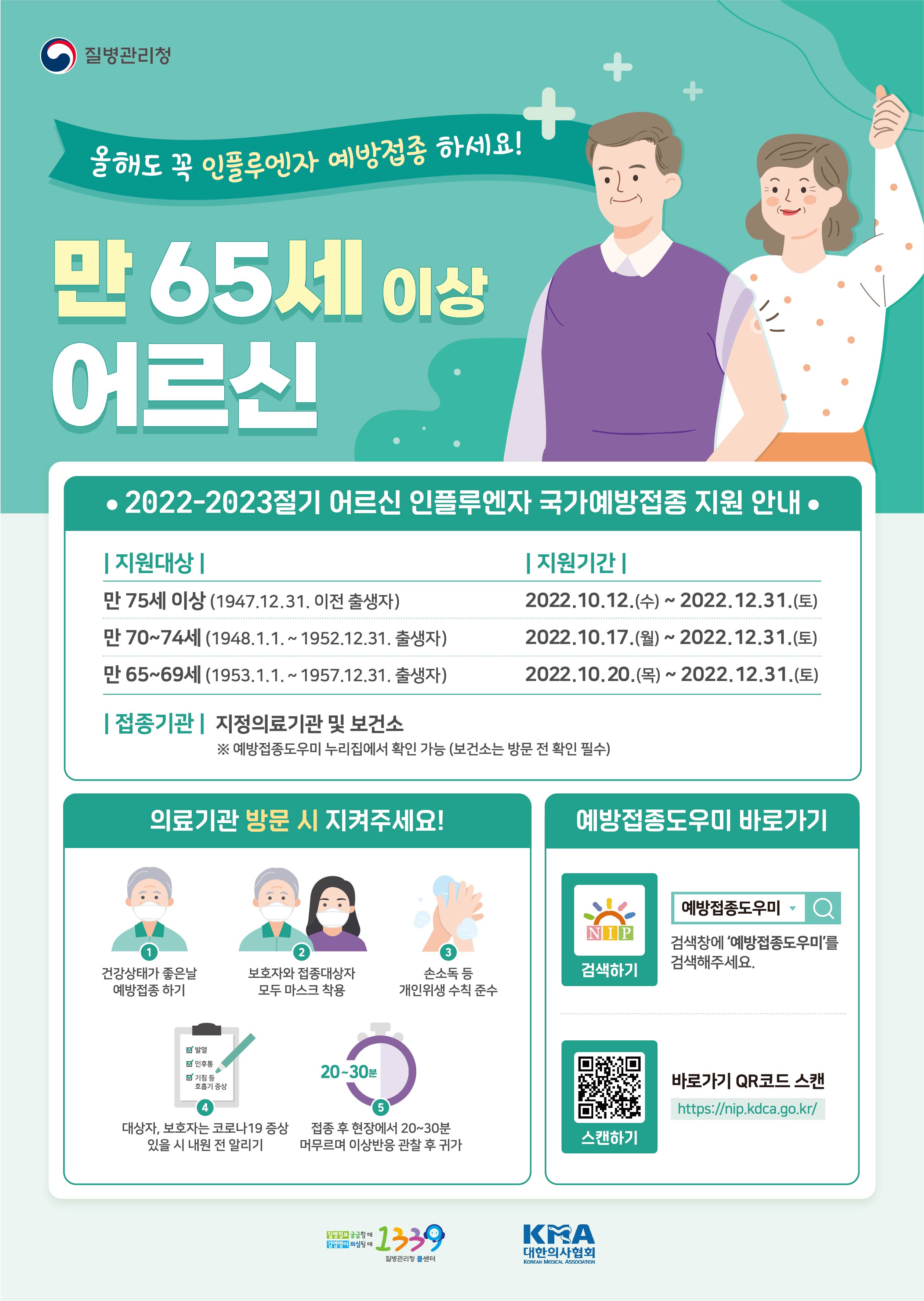 22년 10월 20일부터 만 65세 이상 모든 연령대 어르신들을 대상으로 독감 무료 접종이 가능합니다.