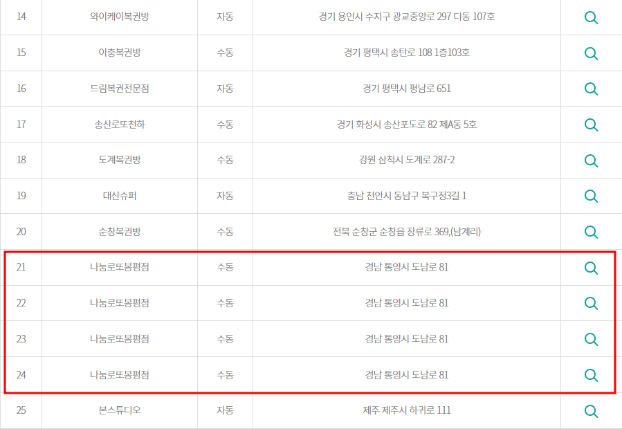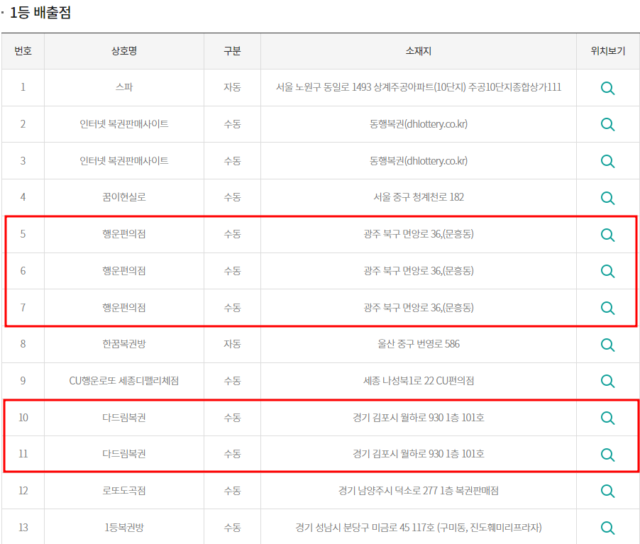 1041회 당첨유형을 보면 자동 6명, 수동 19명으로 압도적으로 수동이 많은 것을 알 수 있습니다. 아래 당첨자 현황을 보면 당첨자가 25명이 아닌 중복 당첨자가 다수 있을 것으로 예상이 됩니다. 광주 북구 행운 편의점에서는 수동 당첨자가 3명, 김포 월하로 다드림 복권에서는 수동 당첨자 2명, 경남 통영 나눔 로또 봉평점에서는 수동 당첨자가 무려 4명을 배출했습니다. 수동으로 다수의 당첨자를 배출한 것이 우연의 일치인지 중복 당첨자가 나온 건지는 알 수 추측만 할 뿐입니다.