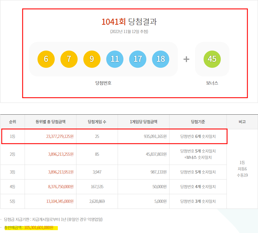 1041회 로또 당첨결과 1등은 총 25명으로 1인당 약 9억 3천5백만 원을 받게 됩니다. 지난 6월 11일 1등 당첨자가 50명이 나왔던 1019회 다음으로 제일 낮은 당첨금입니다.