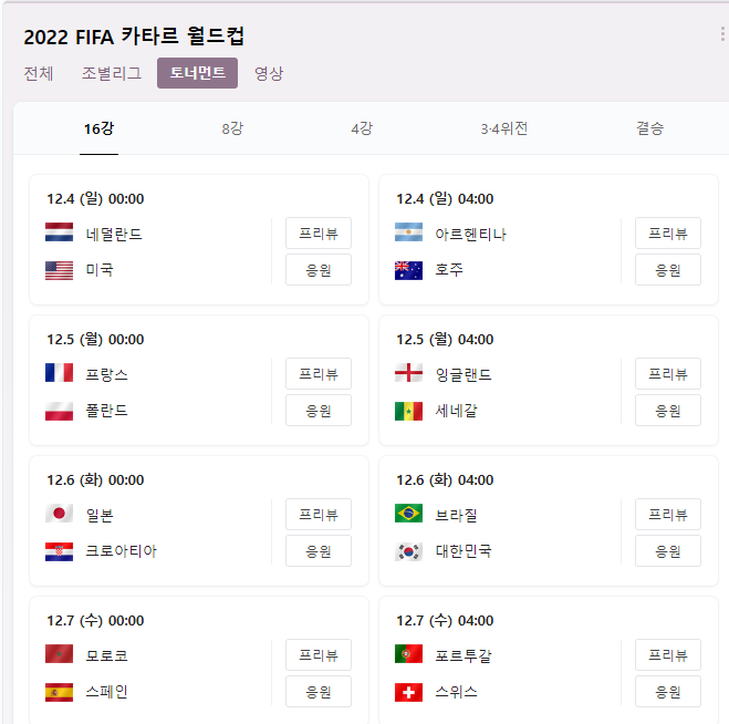 2022 카타르 월드텁 16강 대진표가 완성되었습니다. H조 2위로 극적으로 16강을 진출한 한국은 12월 4일 새벽4시 브라질과 격돌하게 됩니다.