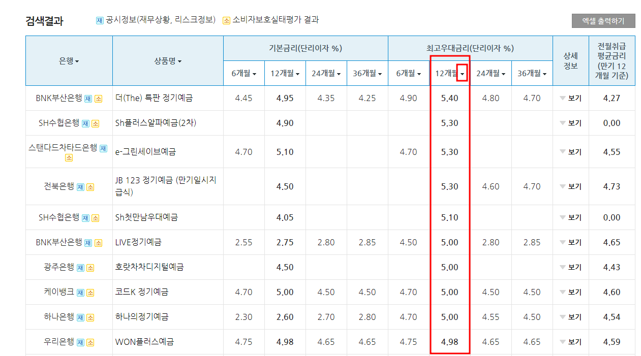 - 검색결과가 나오면 최고우대금리(6개월/12개월/24개월/36개월) 선택가능하며 화살표 방향을 눌러보면 오름차순 or 내림차순으로 정렬이 가능합니다.