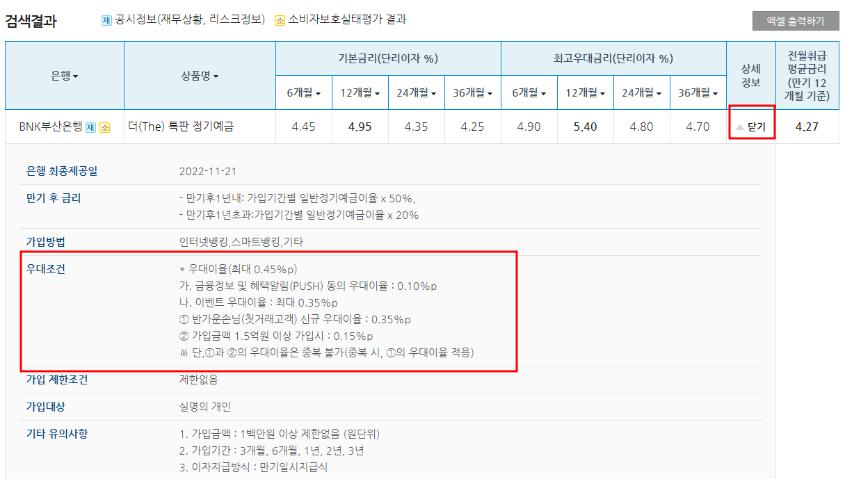 - 오른쪽 상세정보를 누르면 은행 금리 제공일자/만기 후 금리/가입방법/우대조건을 확인할 수 있습니다.