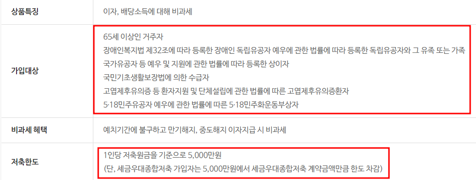 비과세 - 노인, 장애인 등에 대하여 1인당 5,000만원 이내에서 거치식, 적립식 상품으로 가입할 수 있으며 이자소득에 대해서는 비과세하고 한도 내에서 여러 금융기관과 거래할 수 있습니다.