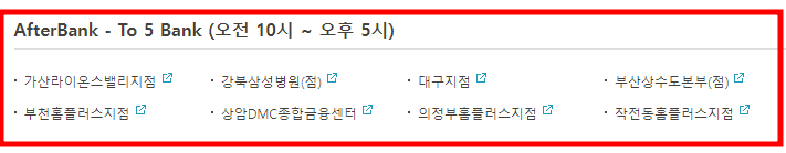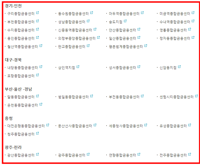 아래 지점은 오전9시~ 오후6시까지 운영되는 전국 점포이며 기업금융창구와 VIP라운지는 운영되지 않습니다.