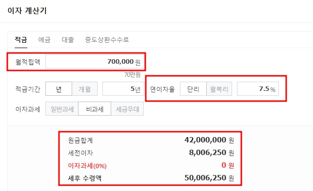 월 70만원 5년 납입 만기 시 5000만 원 목돈을 만들기 위해서는 연 7.5% 이자율이 적용되는 적금에 가입했을 때 가능한 금액입니다. 청년도약계좌는 시중은행 적금 금리에 정부 별도 기여금을 최대 6% 지원하는데요. 기여금은 소득에 따라 차등지원되며 지원 방식에 대해서는 아직 정해지지 않았습니다.