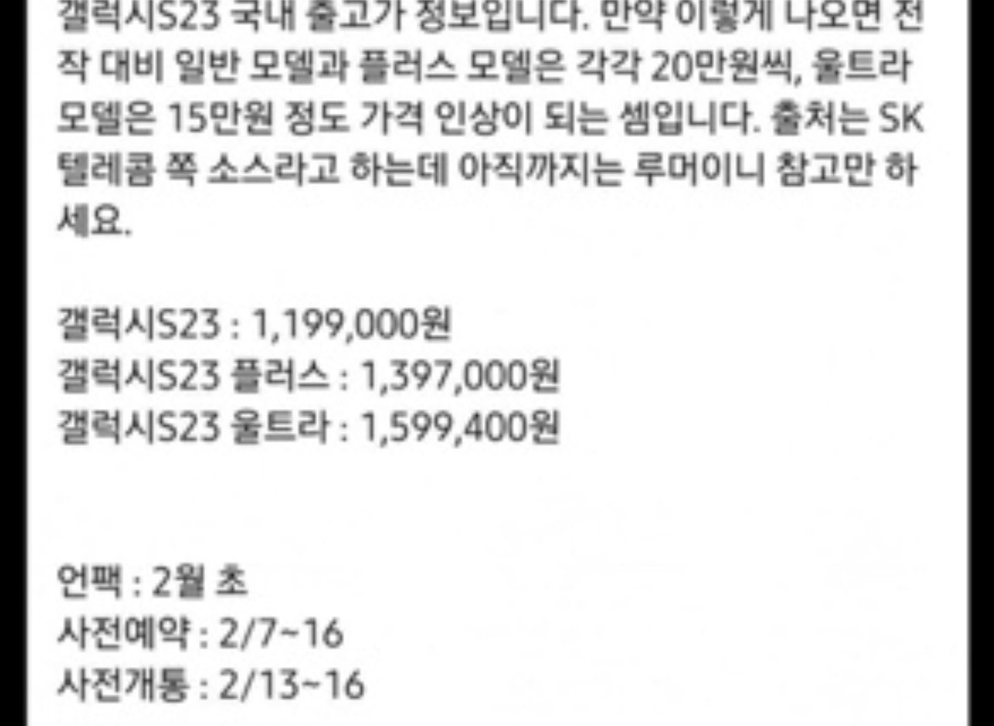 온라인상에서 갤럭시 s23 출고가격은 전작대비 갤럭시 s23 기본,플러스의 경우 20만원 이상, 울트라 256GB 기준 15만원이 인상될 것이라는 루머가 떠돌고 있습니다. 해당 내용은 확실치 않은 루머일뿐 참고만 하시기 바랍니다.