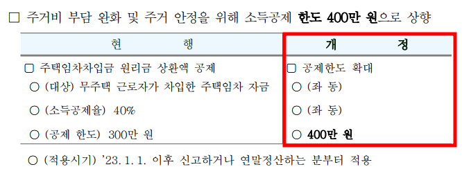 무주택 세대주가 주택을 임차하기 위해 차입한 자금의 공제한도가 기존 300만원 → 400만 원으로 확대