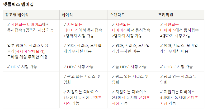 광고형 베이식은 1명, 베이식 요금제는 동시접속 1명, 스탠다드 요금제는 동시접속 2명, 프리미엄 요금제는 동시접속 4명까지 가능합니다. 현재 가구 구성원이 아니더라도 프리미엄 요금제의 경우 4명이서 공유해 1인당 4,250원에 넷플릭스를 이용할 수 있었습니다.