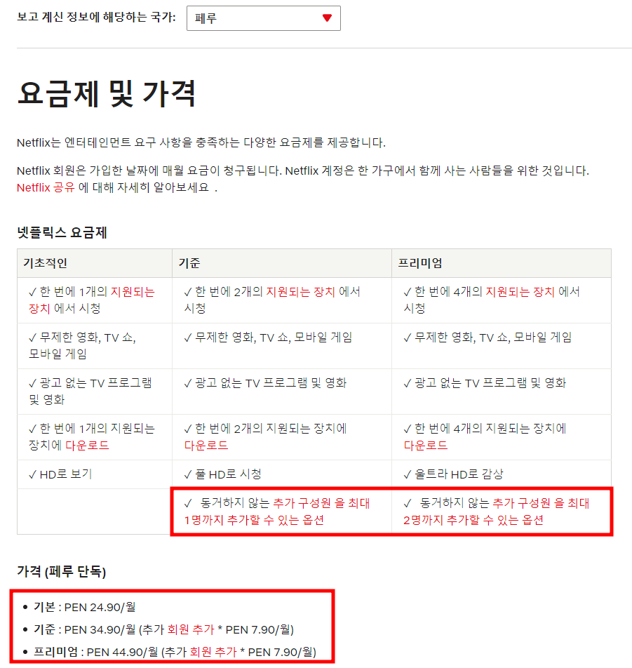 넷플릭스 계정 공유 추가 요금이 적용중인 페루 요금 방식