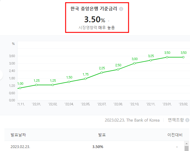 지난 23일 한국은행 금융통화위원회에서 기준금리를 동결하기로 결정하면서 한국 기준금리는 3.5%가 당분간 유지됩니다. 1년 5개월간 총 7번의 연속 인상이 멈추고 숨 고르기를 하면서 한국과 미국의 기준금리 격차1.25% 가 됩니다.