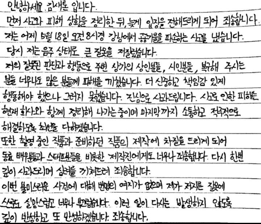 사고 직후 개인 SNS 통해 자필 사과문을 올리며 배우 활동 중단을 선언하며, 출연 예정작인 었던 sbs 드라마 '트롤리'에서 하차했습니다.