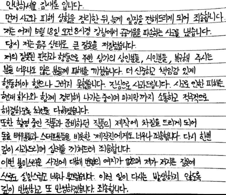 김새론은 사고 직후 개인 SNS 통해 자필 사과문을 올리며 배우 활동 중단을 선언하며, 출연 예정작인 었던 sbs 드라마 '트롤리'에서 하차했습니다.