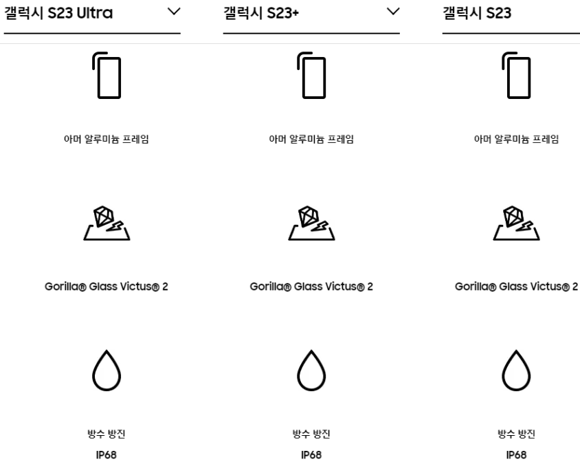 갤럭시 s23 시리즈에는 고릴라글라스빅터스 2가 탑재되어 별도의 화면 보호 필름을 붙이지 않을 정도로 강화된 유리를 선보였습니다. 아머 알루미늄 프레임을 사용하여 내구성을 향상했고 방수, 방진 IP68 등급으로 생활 방수가 가능한 기능이 포함되었습니다.