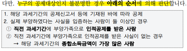 ② 직전 과세기간에 부양가족으로 인적공제를 받은 사실이 없는 경우 → 해당 과세기간의 종합소득금액이 가장 많은 사람